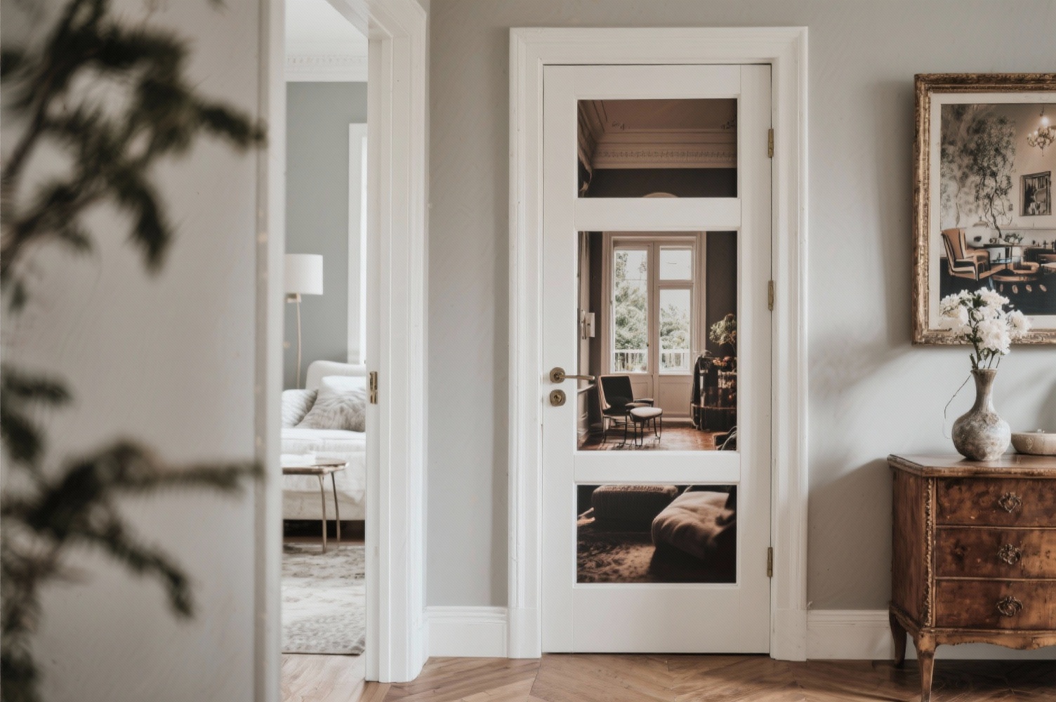И не забывайте про детали! Вертикальная фрезеровка на полотне добавляет изображению глубины и динамики, а дизайнерская фурнитура — ручки, молдинги — завершает образ. Сейчас в тренде дверные коробки скрытого монтажа с отделкой под шпон или даже зеркалами, которые буквально «растворяют» дверь в стене, оставляя в центре внимания только вашу уникальную картинку.